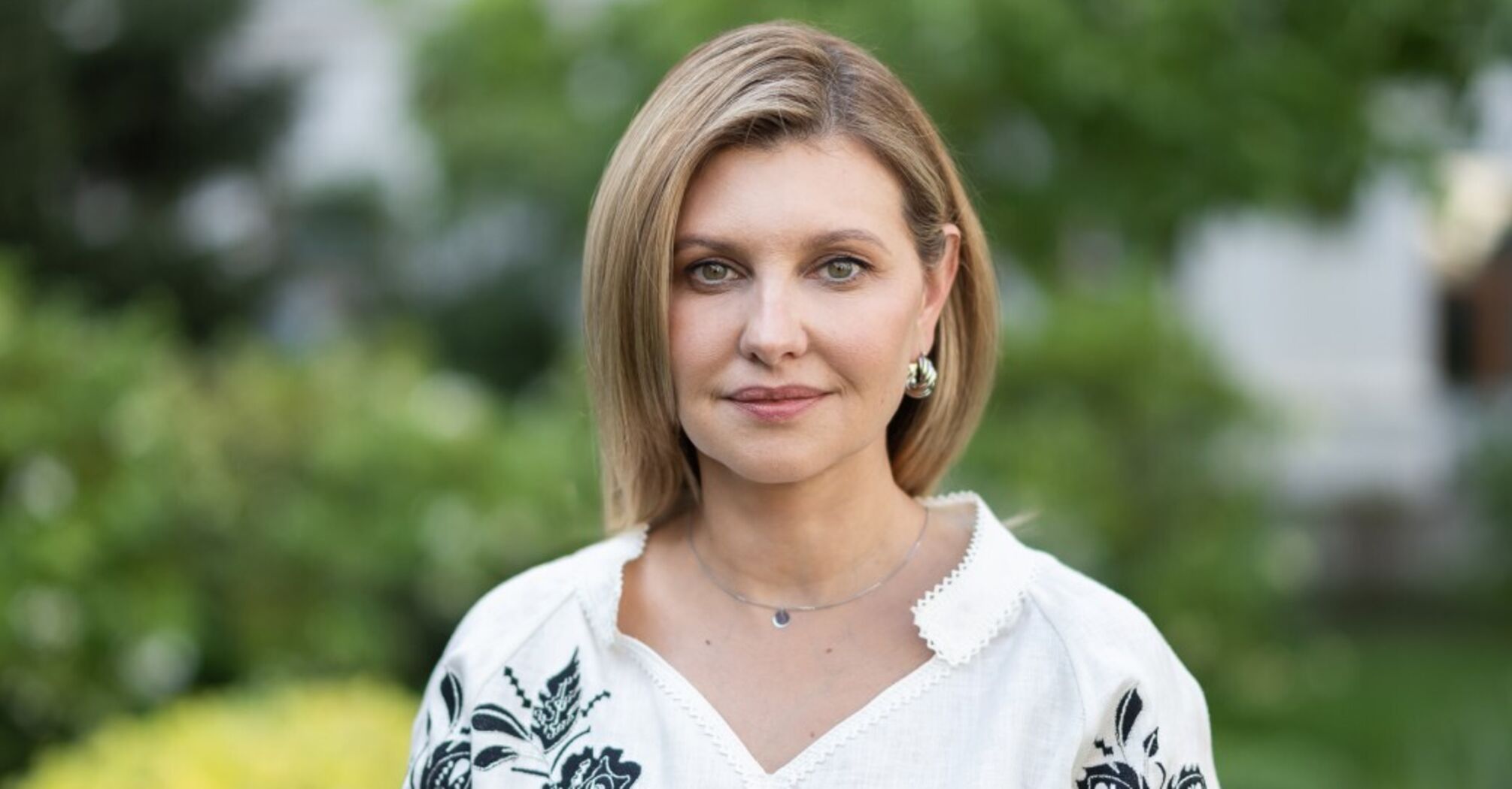 Zelenska appeared in front of the camera wearing a milky embroidered shirt made of natural linen and covered with black floral patterns. The model by the Ukrainian brand Gaptuvalnya is a loose-fitting shirt.