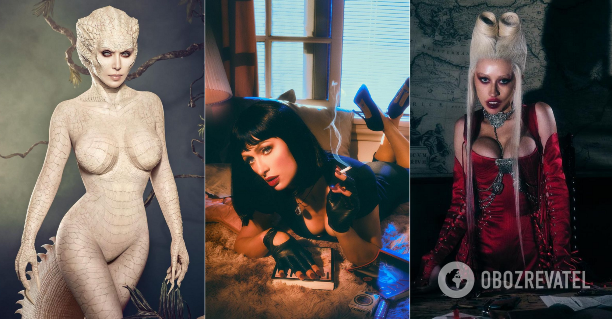 This year, socialite Kim Kardashian surprised fans with a realistic albino alligator costume. Thanks to professional makeup, the businesswoman was hardly recognizable – the star wore green lenses and her skin was covered with white scales. The costume was accented by a huge tail.