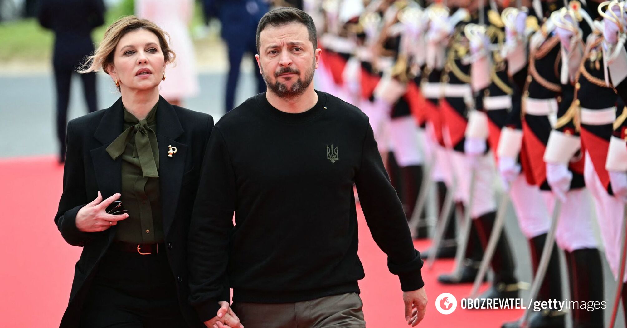 The Zelenskyy couple's looks can be called paired as they were in perfect harmony with each other. The First Lady of Ukraine wore a classic black suit with wide pants, which she almost always chooses for official events.