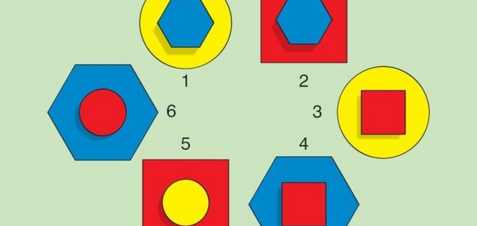 In the picture with the test published by OBOZ.UA, you can see six combinations of colored figures arranged according to a certain principle. Can you identify this principle and find the wrong combination in 10 seconds?