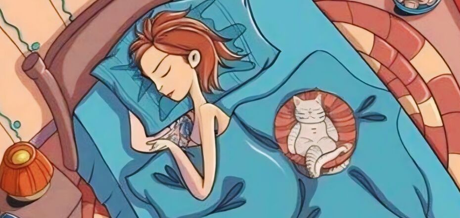 In the picture, you see a girl sleeping soundly on the bed in her room. She is accompanied by a cat and a dog, but these are not all the animals in the picture. There is a small rabbit hiding somewhere in the room. Try to find it in 5 seconds