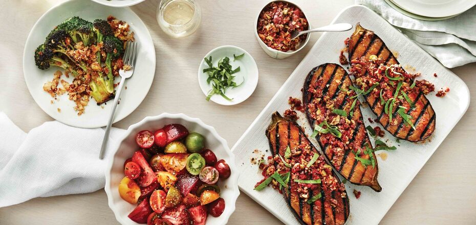 - Prepare the spicy salsa. Cut the tomatoes into small cubes, and finely chop the garlic, chili, and herbs with a knife. Mix everything, season with olive oil and salt, and mix again. Serve the salsa with the cooked eggplant.