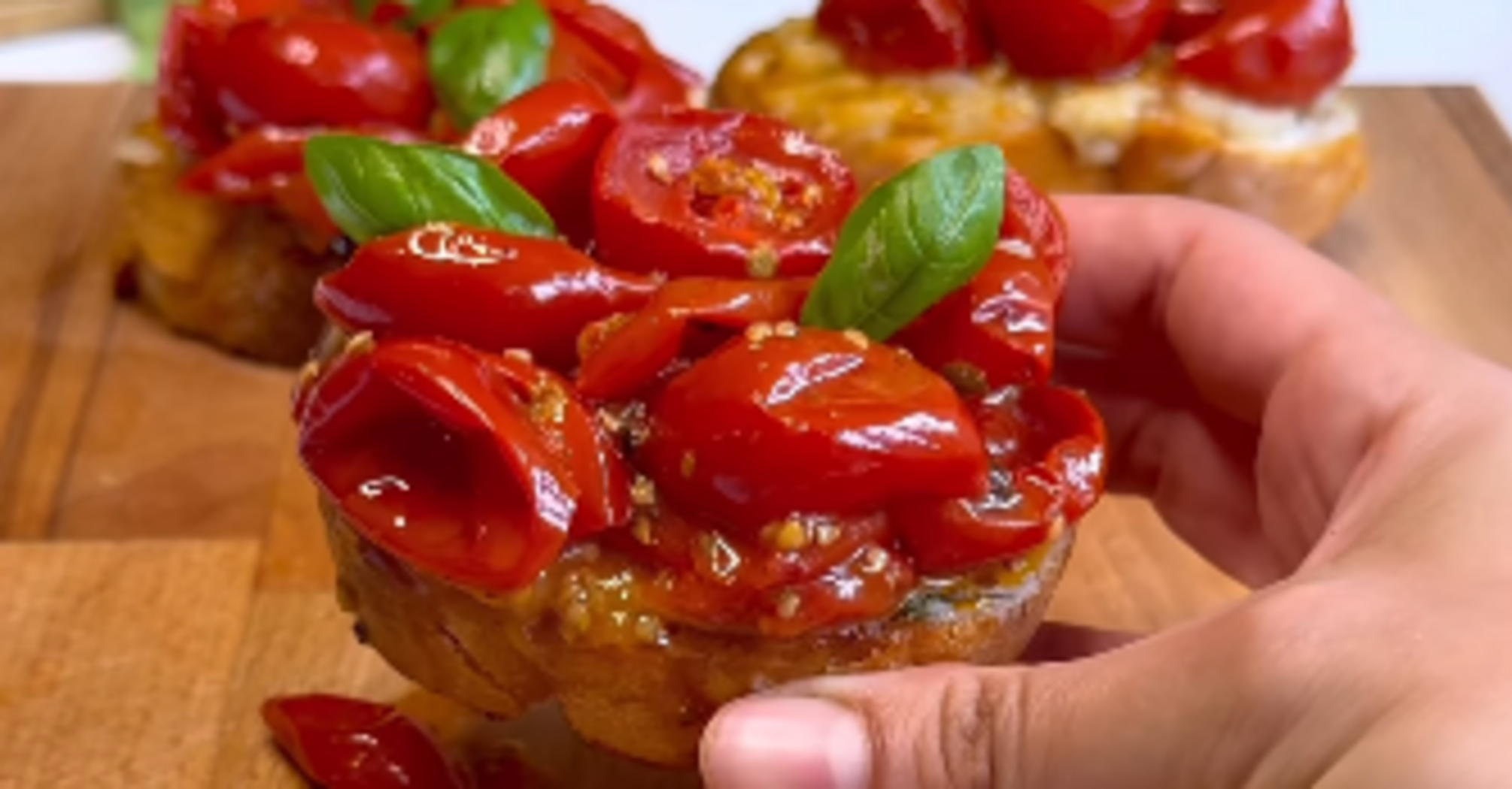 6. Put the baked cherry tomatoes on top and garnish with basil leaves.