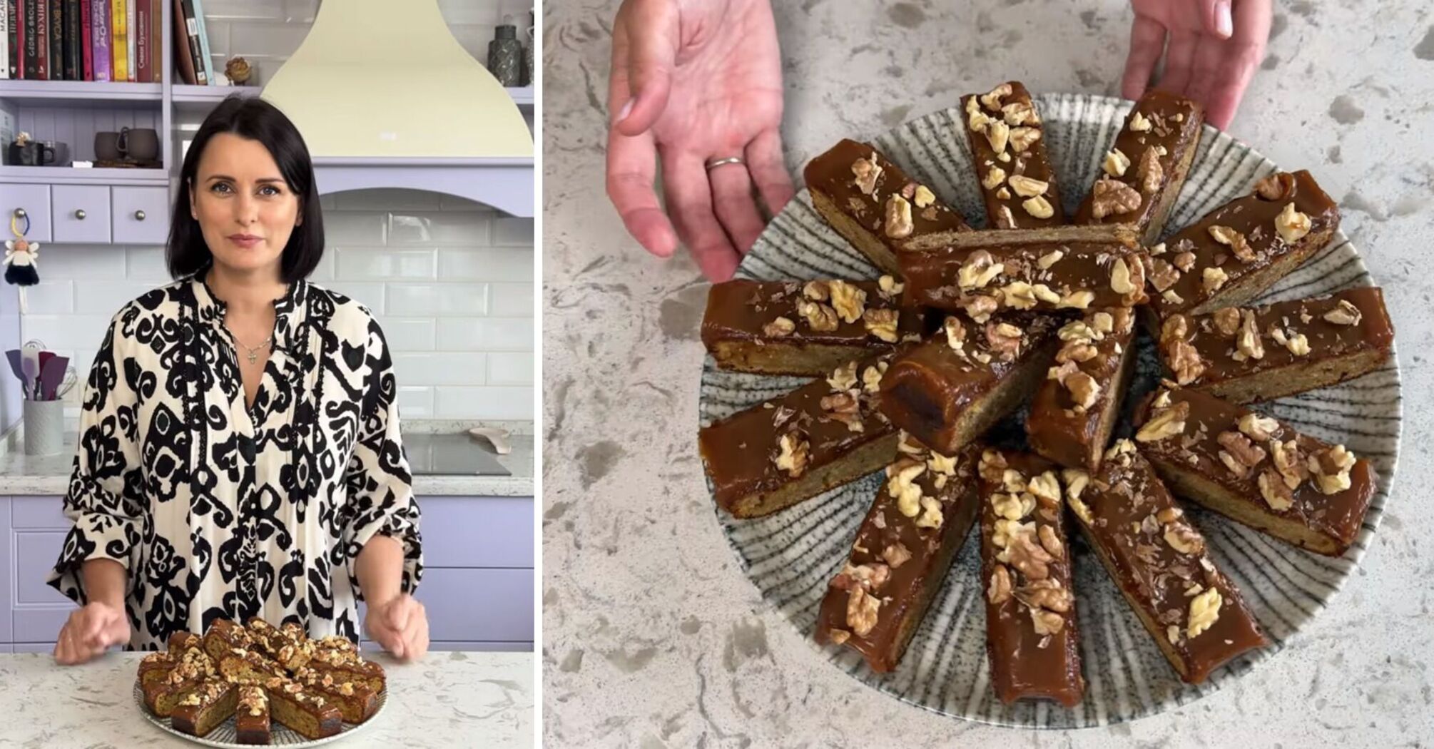 - Take the roasted walnuts, sprinkle them over the cake, cut into pieces, and enjoy.