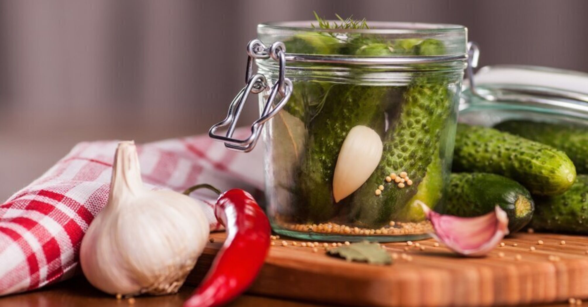 Cucumbers can be preserved with garlic, pepper, onion, bell pepper, mustard, vinegar, and ground black pepper. It is very important to remember that jars and lids must be sterilized very well beforehand.