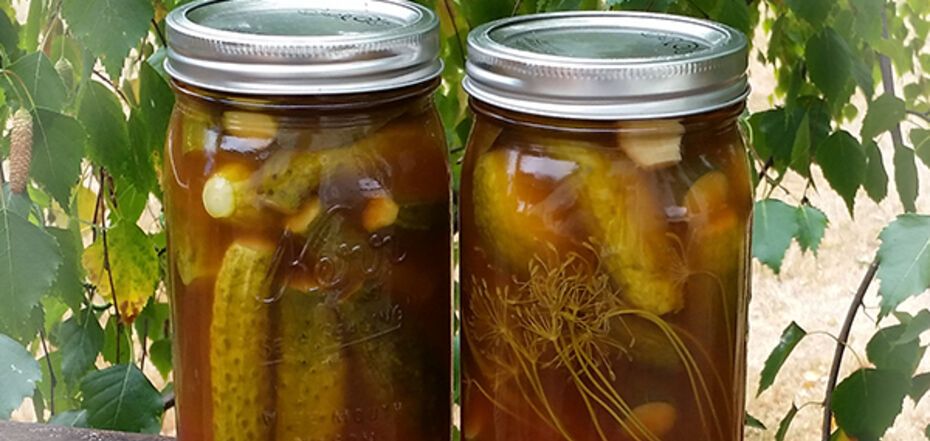 3. Pour the hot marinade over the cucumbers and sterilize for 10 minutes. Then close with the lids.
