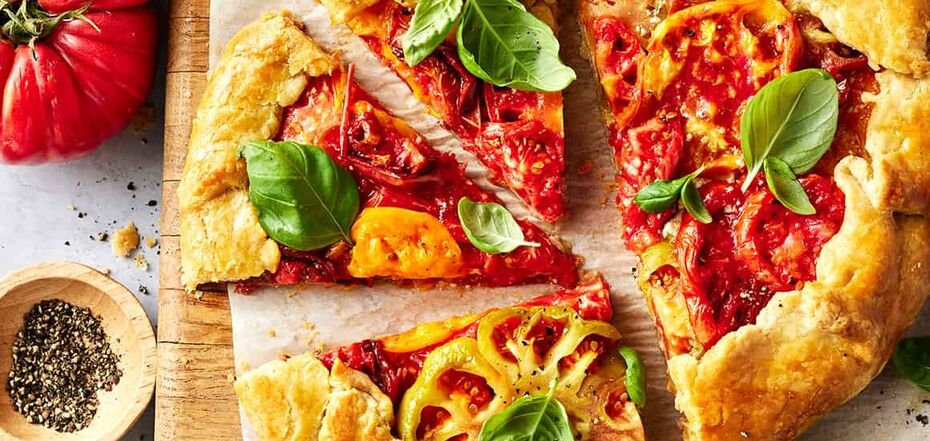 Galette can be made not only with strawberries and peaches, but also with tomatoes. This dish is much easier to make than a classic pizza. The dough is crispy and goes well with the juicy filling.