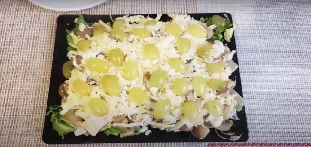 The exquisite Madame salad is based on chicken, grapes, and hard cheese. The dish is dressed with regular mayonnaise. The dish is spectacular, bright and very satisfying.