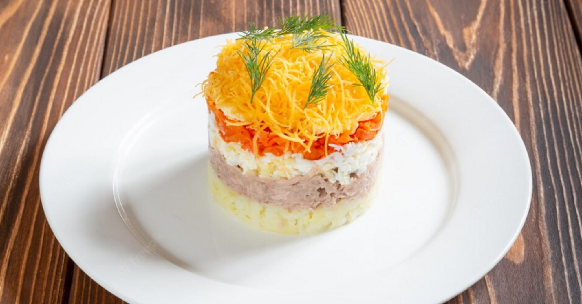 This is a festive salad that is much easier to prepare than the classic Olivier and Shuba but looks no less impressive. It is also very budget-friendly as you need only 4 ingredients. All of them complement each other perfectly.
