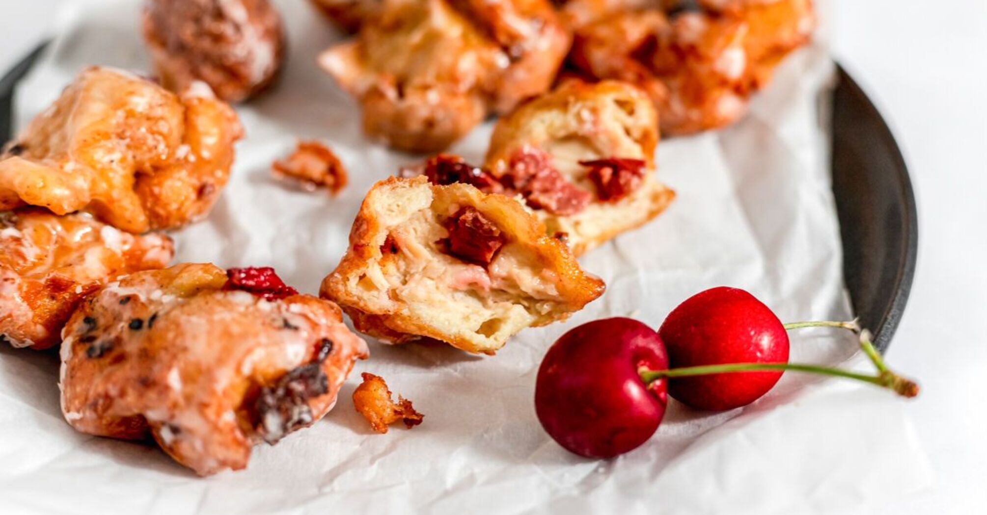 Fluffy fried pancakes with sweet cherries: do not burn and do not fall off