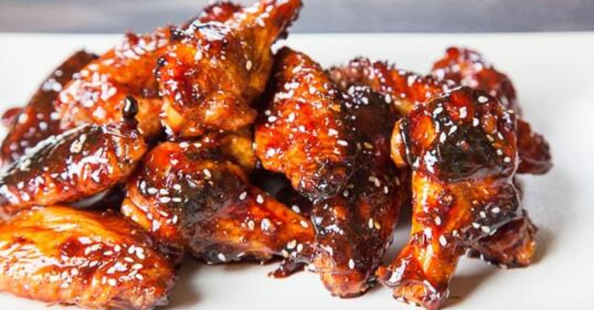 Golden fried wings in teriyaki sauce: the meat just melts in your mouth