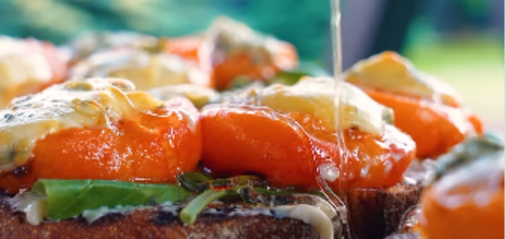 Grilled apricots: served with cheese, honey, and crispy bread
