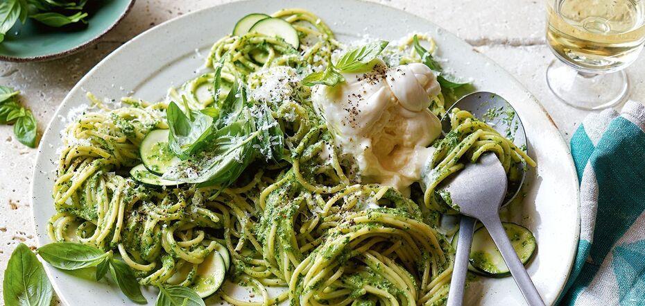Healthy and tasty: zucchini pasta with cheese and tomatoes for dinner