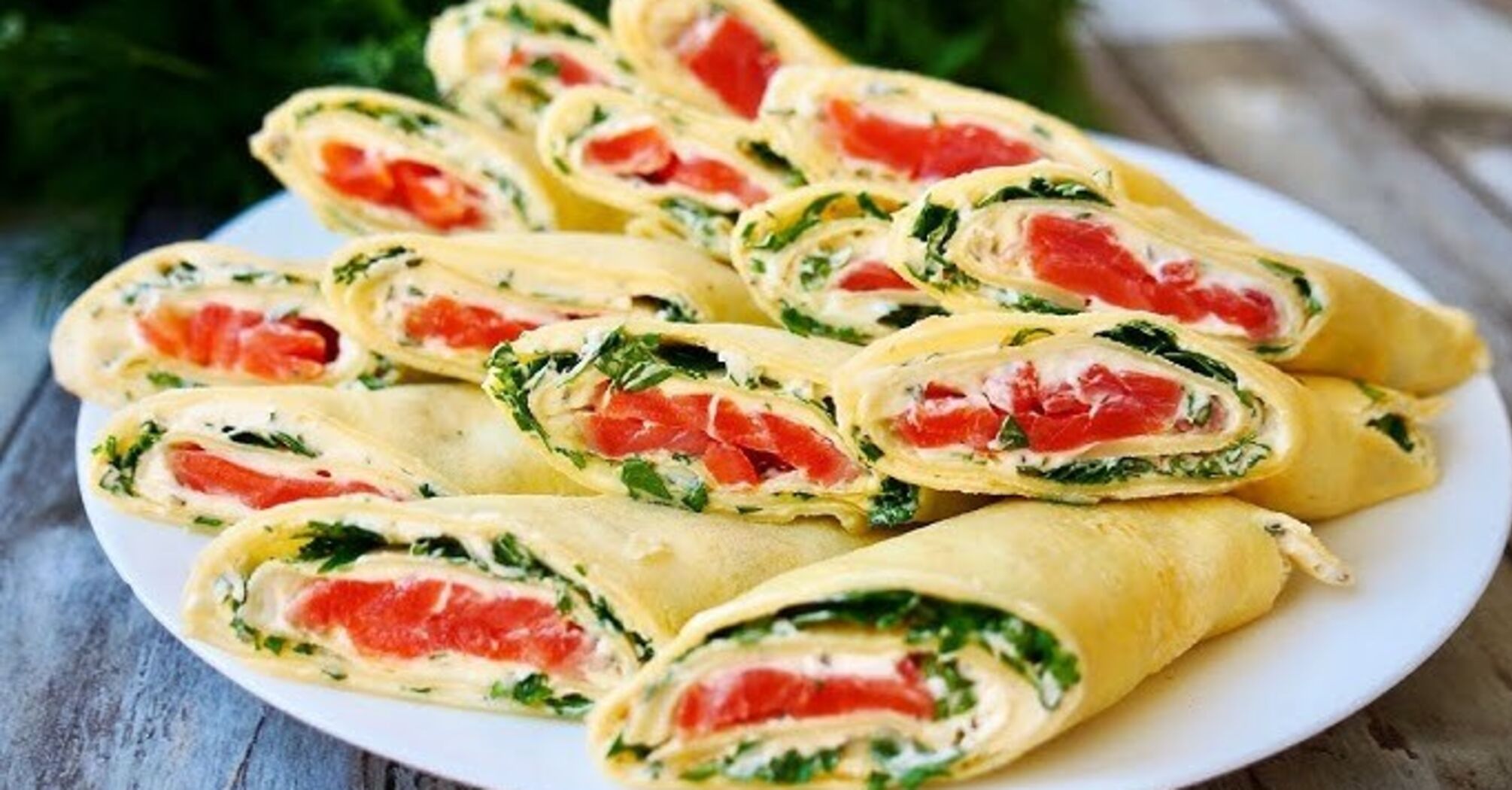 Hearty thin pancakes with cheese and red fish: be sure to cook them for lunch