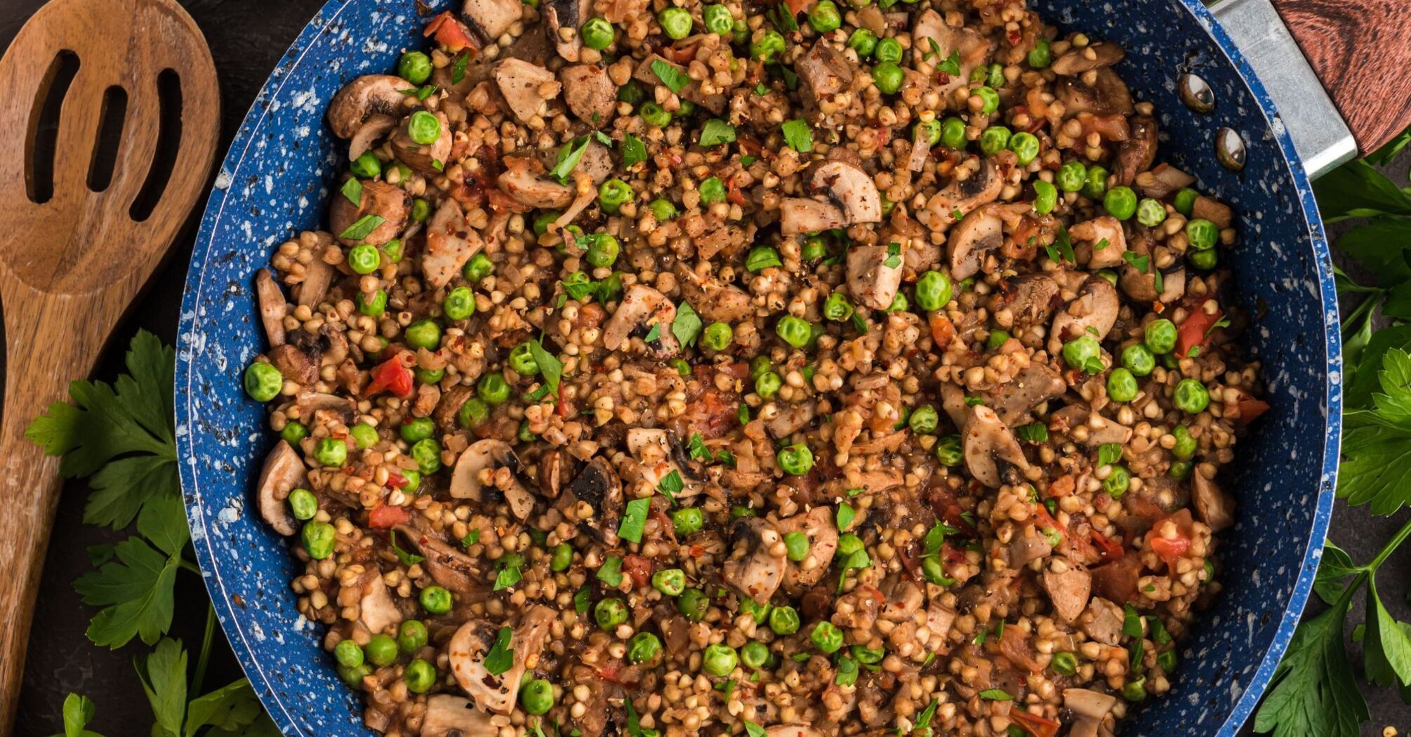 6. Add buckwheat to the vegetables, stir, and fry for a minute.