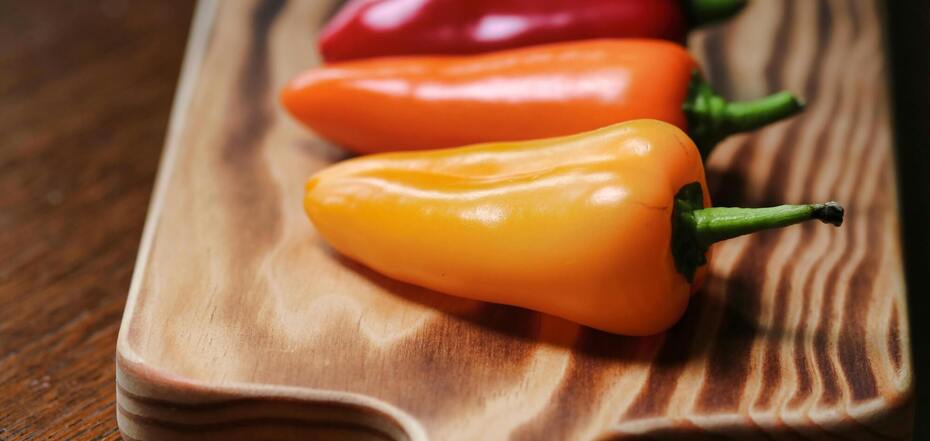 First of all, Lori took a clean pepper and placed it on its side on the board. Next, she cut off the green tip of the pepper as close to the edible part as possible.