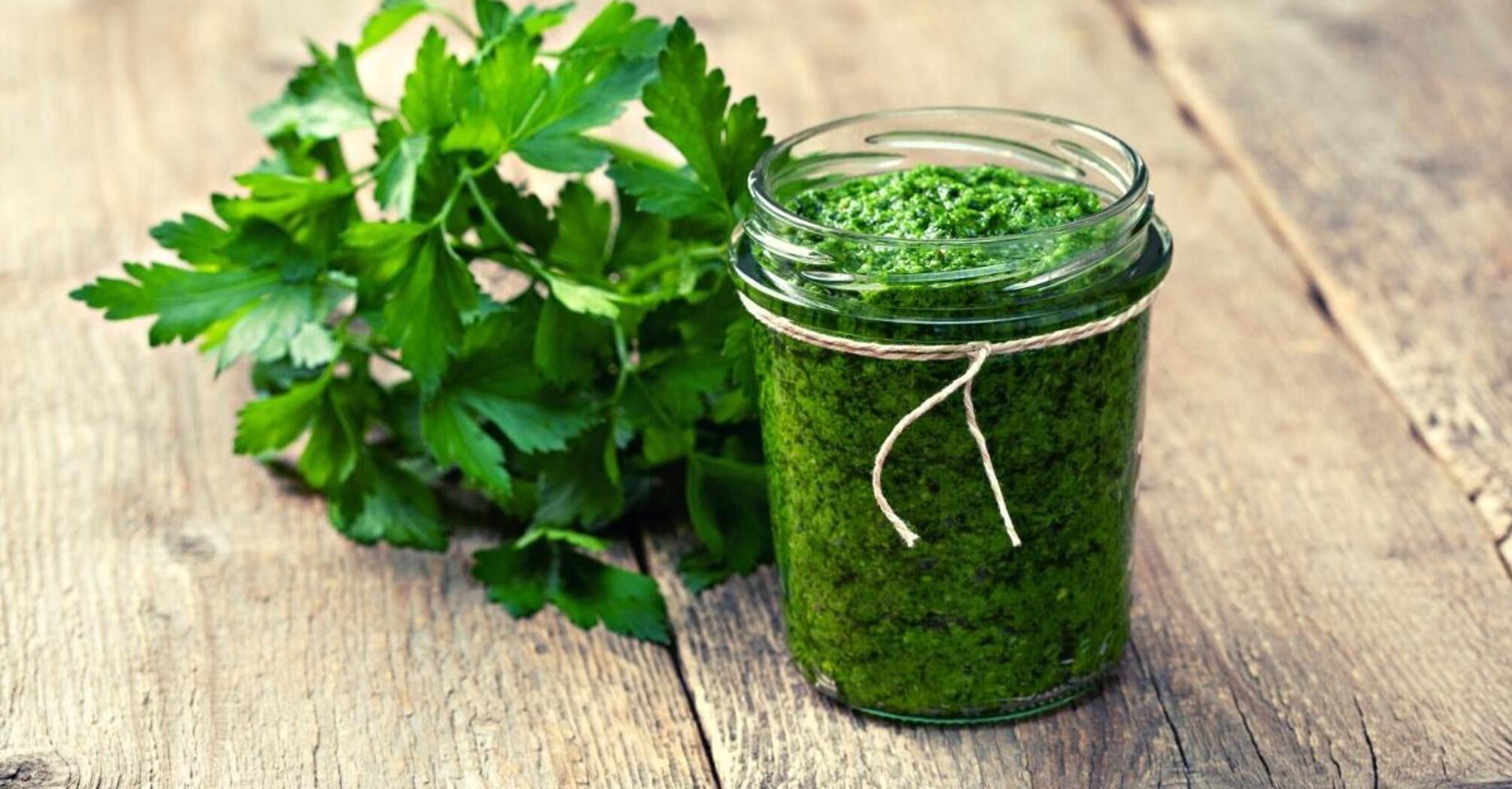The idea of making parsley pesto sauce was published on the Instagram page of food blogger Daria with the nickname treskablog. It is best stored in a glass container.