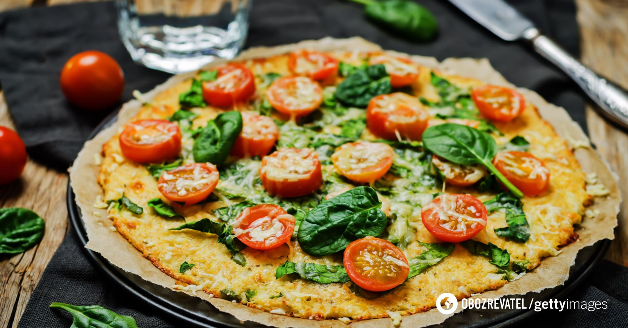 The main feature of healthy pizza is the absence of flour and standard dough. Instead, chicken, quinoa, spinach, sweet potatoes, and even cauliflower are used.