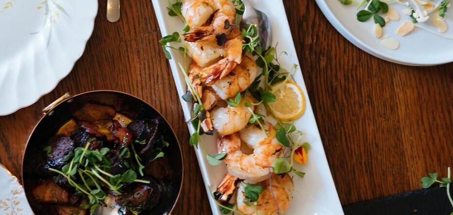 3. Put the salad mix, grapes, olives, and shrimp on a plate.