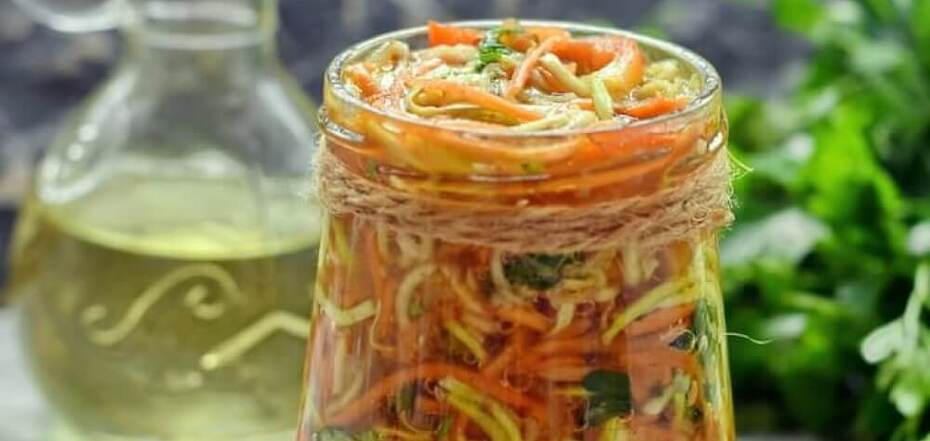 Korean-style vegetables are a delicious savory appetizer that will perfectly complement any festive table or become an ingredient for an independent dish. Zucchini is very tasty in this way. They are crispy, flavorful, and juicy. They can be stored for the winter.