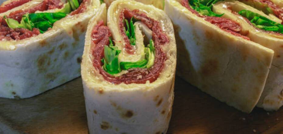 When you don't have much time to cook, pita bread always comes in handy. You can wrap any delicious filling in it. For example, you can choose the ingredients that everyone always uses for sandwiches: sausage, cheese, and tomatoes.