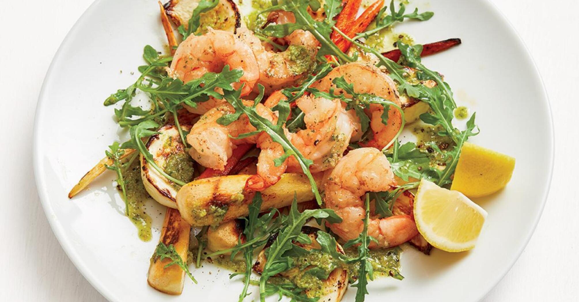 This salad is quite satisfying at light at the same time. This is because it is prepared with shrimp. And instead of oil, mayonnaise or sour cream, it will be delicious to make a nut dressing.