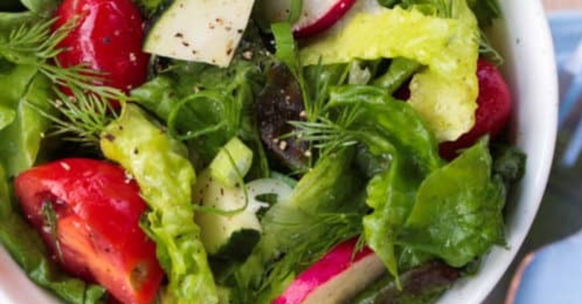 Light spring salad of fresh vegetables and greens: what to dress with