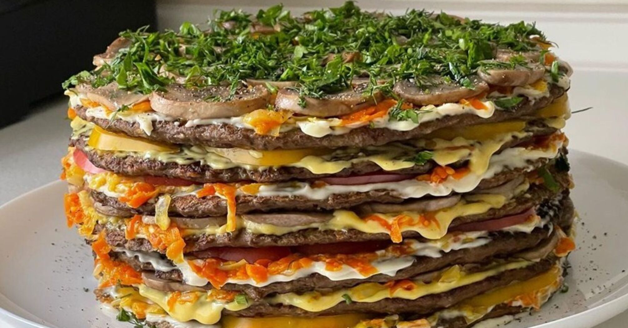The liver cake is based on tender and fluffy liver pancakes and a juicy filling: carrots, onions, mushrooms, fresh vegetables, and herbs. You can use either regular mayonnaise, cream cheese, or sour cream for the filling.