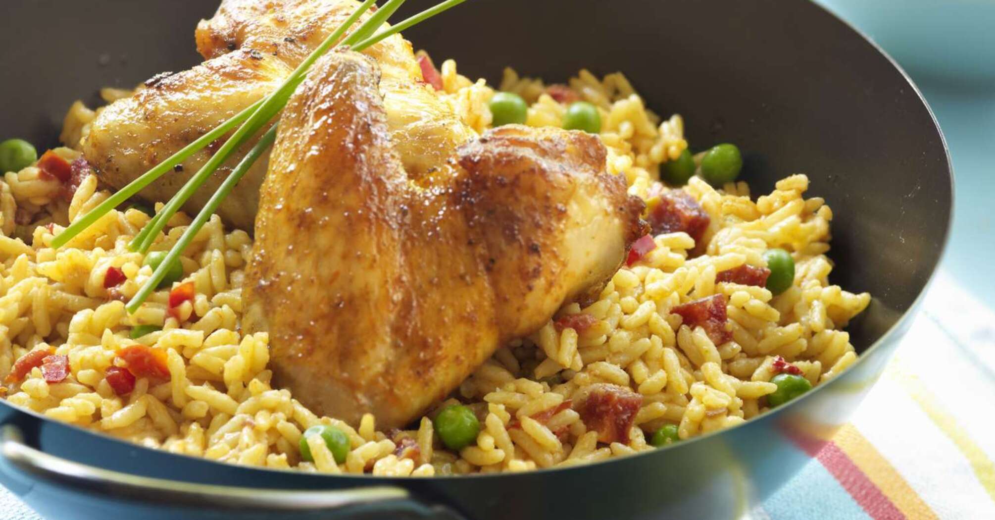 It is very convenient to bake chicken and rice in the oven for lunch. You will very quickly get a full meal with both side dishes and meat. As an addition, you can make a fresh salad.