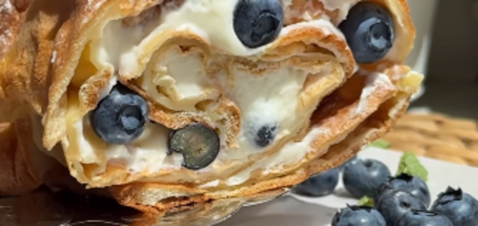 Blueberry pancake roll with blueberry and cheese cream is a dessert that not only has an incredibly interesting taste, but also looks beautiful. It can be served as a tea-time treat or as a treat for guests at a festive table.