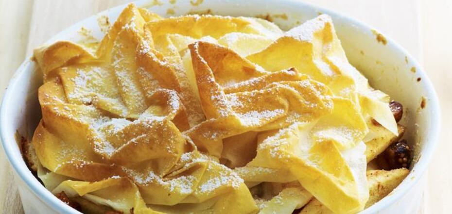 4. Put the cream and pears on the baked base. Top with a sheet of phyllo. Brush it with butter. Place the rest of the sheets randomly, one by one. Brush with a little oil. Bake at 160 degrees for about 30-40 minutes with convection. The cake should be browned. After baking, let it cool. Sprinkle with powdered sugar.