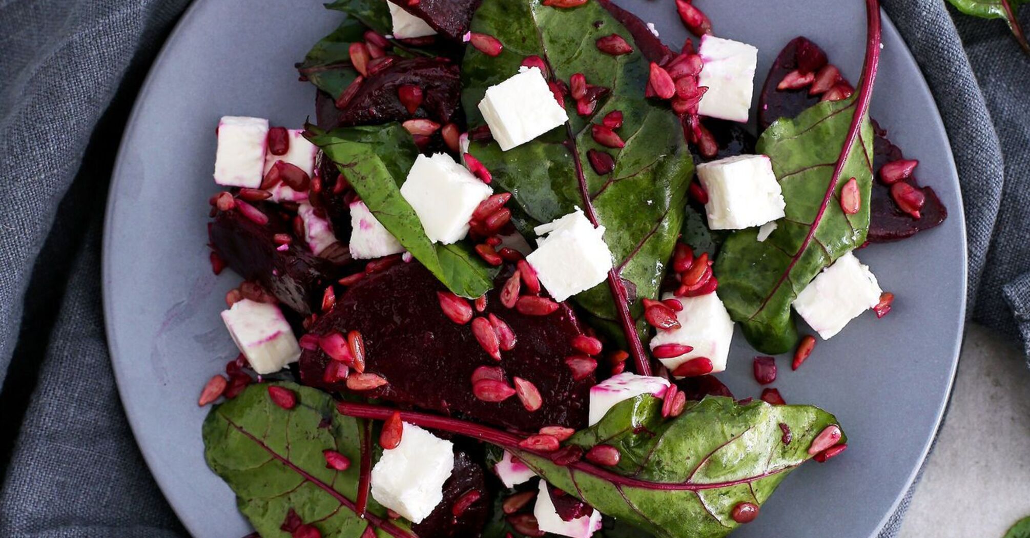 2. Put the leafy greens on the plate first, then the beets, nuts, and cheese slices.