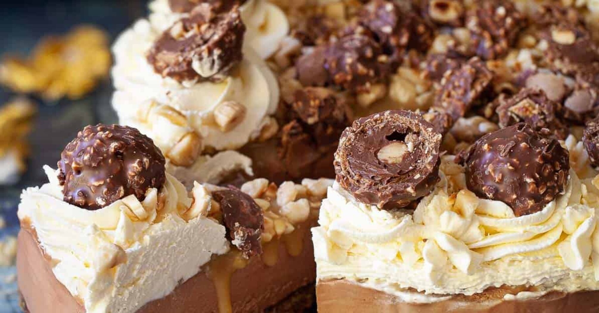 Ferrero roshe is not only a delicious chocolate candy, but also a delicious cheesecake that is very easy to make at home. It is based on ordinary shortbread cookies and cream cheese. Roasted nuts are perfect for the filling.