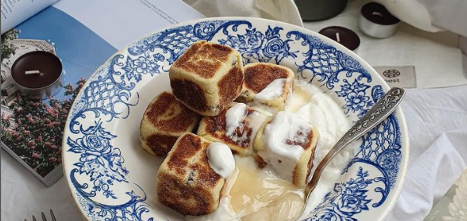 The idea of making crispy square cottage cheese pancakes was published on the Instagram page of food blogger Inna with the nickname foodinna. These syrnyky are fried in butter without the lid.