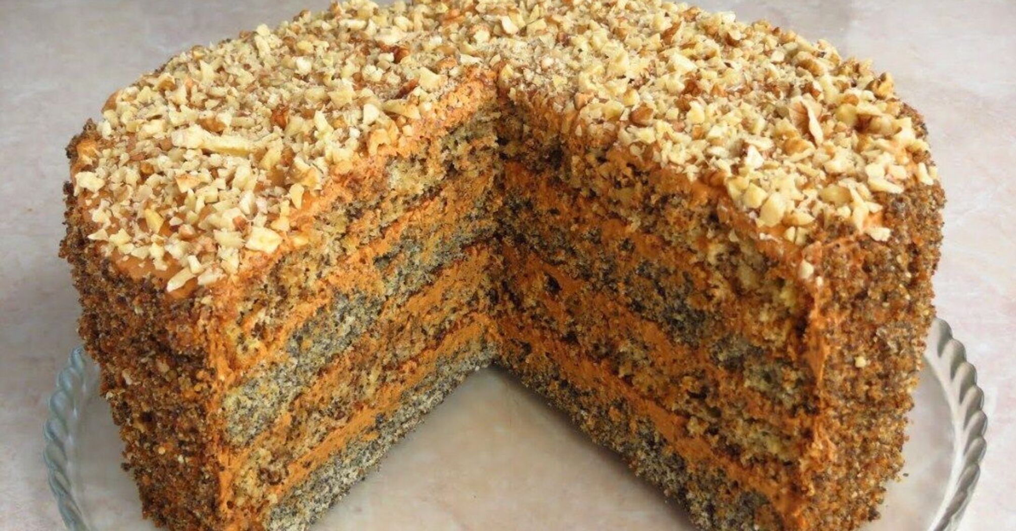 The Whimsy cake is based on two types of sponge cake: poppy seed and walnut, which are very well combined with a stable condensed milk cream. The cake is very well and quickly soaked, tender and moderately juicy.