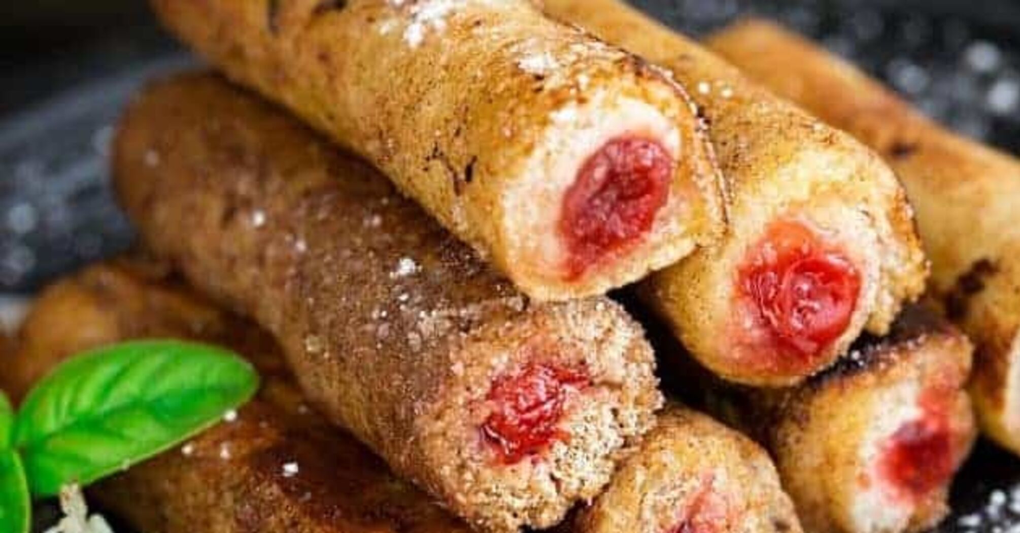 11. Put the cherries in a row on top and roll the pancake into a roll with the help of plastic wrap. Wrap in plastic wrap. Before cutting into rolls, it is advisable to put them in the refrigerator for half an hour.
