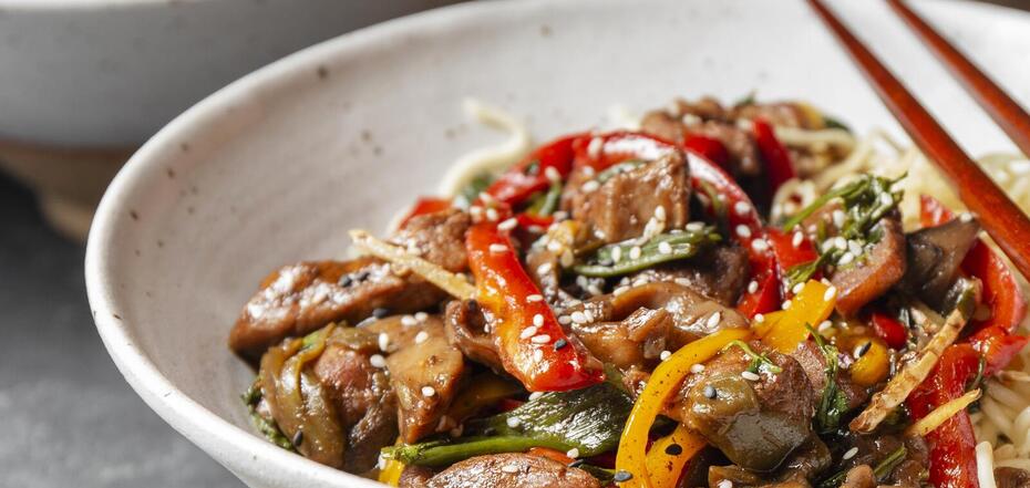 Tastier than pasta: light funchose with vegetables and fillet for dinner