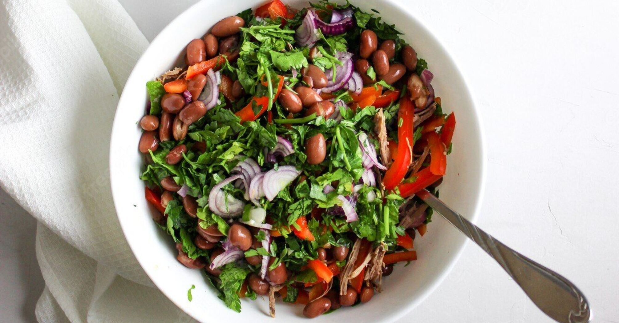 2. Cut the boiled beef into thin strips, put it in a bowl, add the bell pepper and canned red beans. Cut the walnuts into small pieces, add to the salad, as well as chopped parsley, cilantro, and pickled onions.