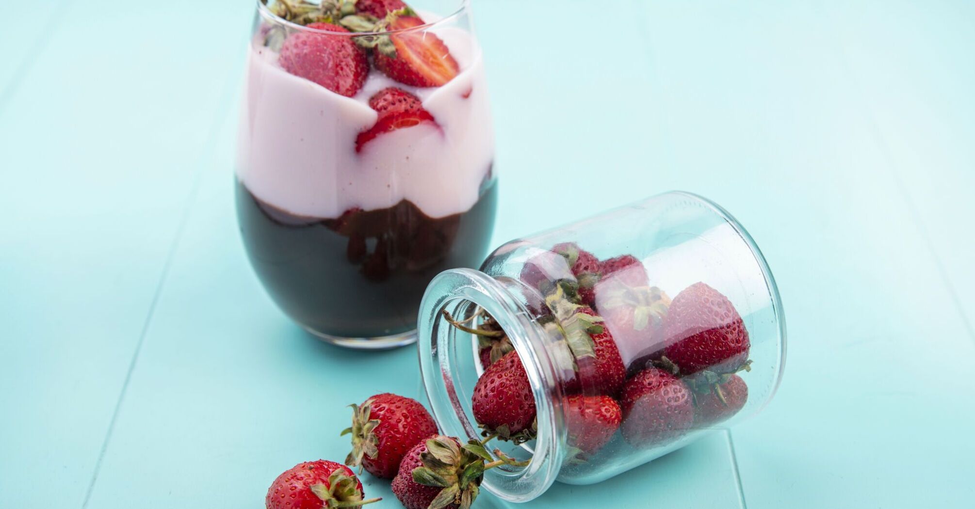 5. Fill them with fresh, washed and chopped strawberries. Pour yogurt on top up to half of the glass.