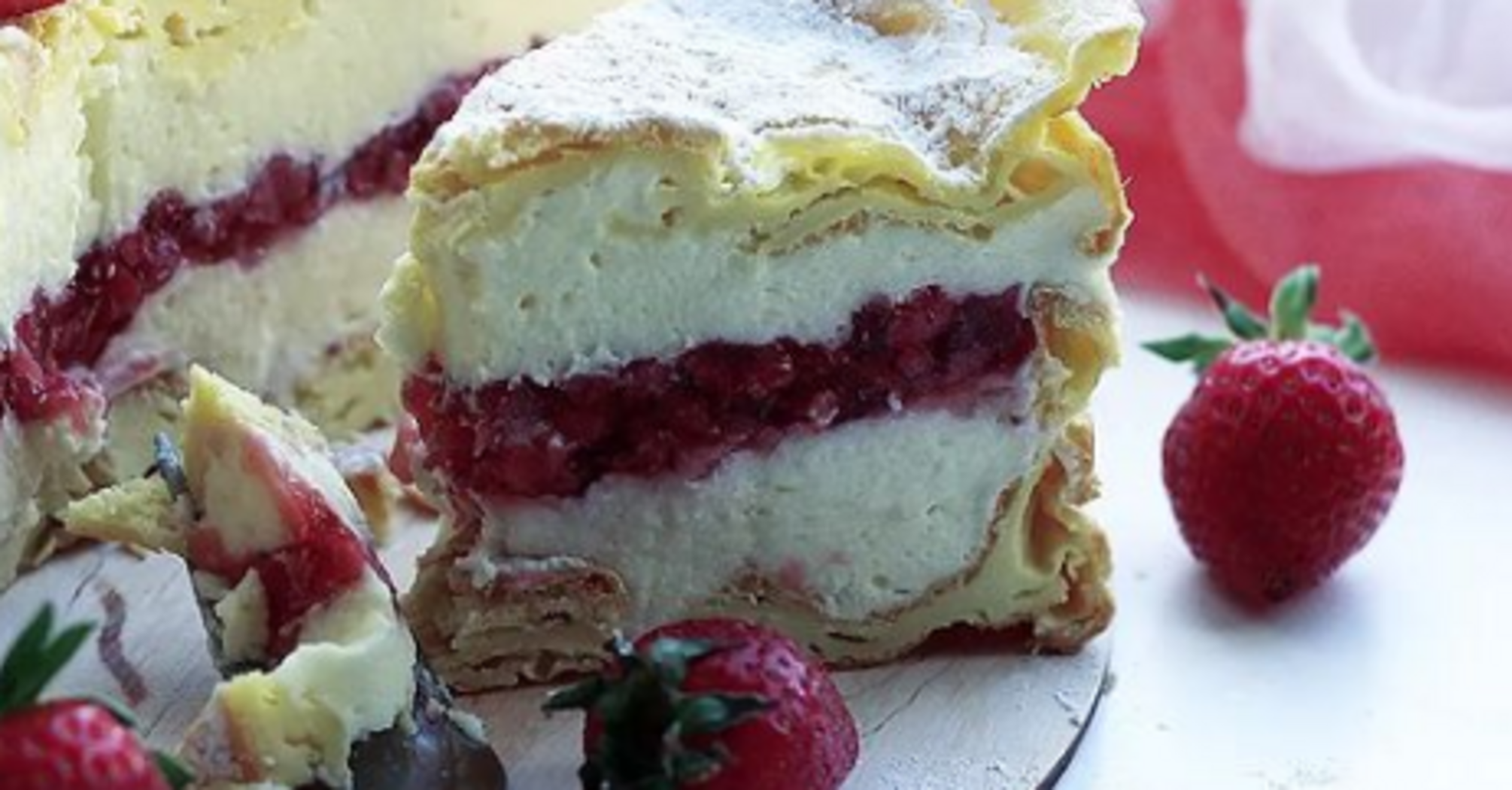 "Karpatka is a traditional sweet Polish pie. It is based on choux pastry, which forms a crispy golden crust. Inside is a delicate strawberry filling, which is perfectly complemented by a delicious butter cream.