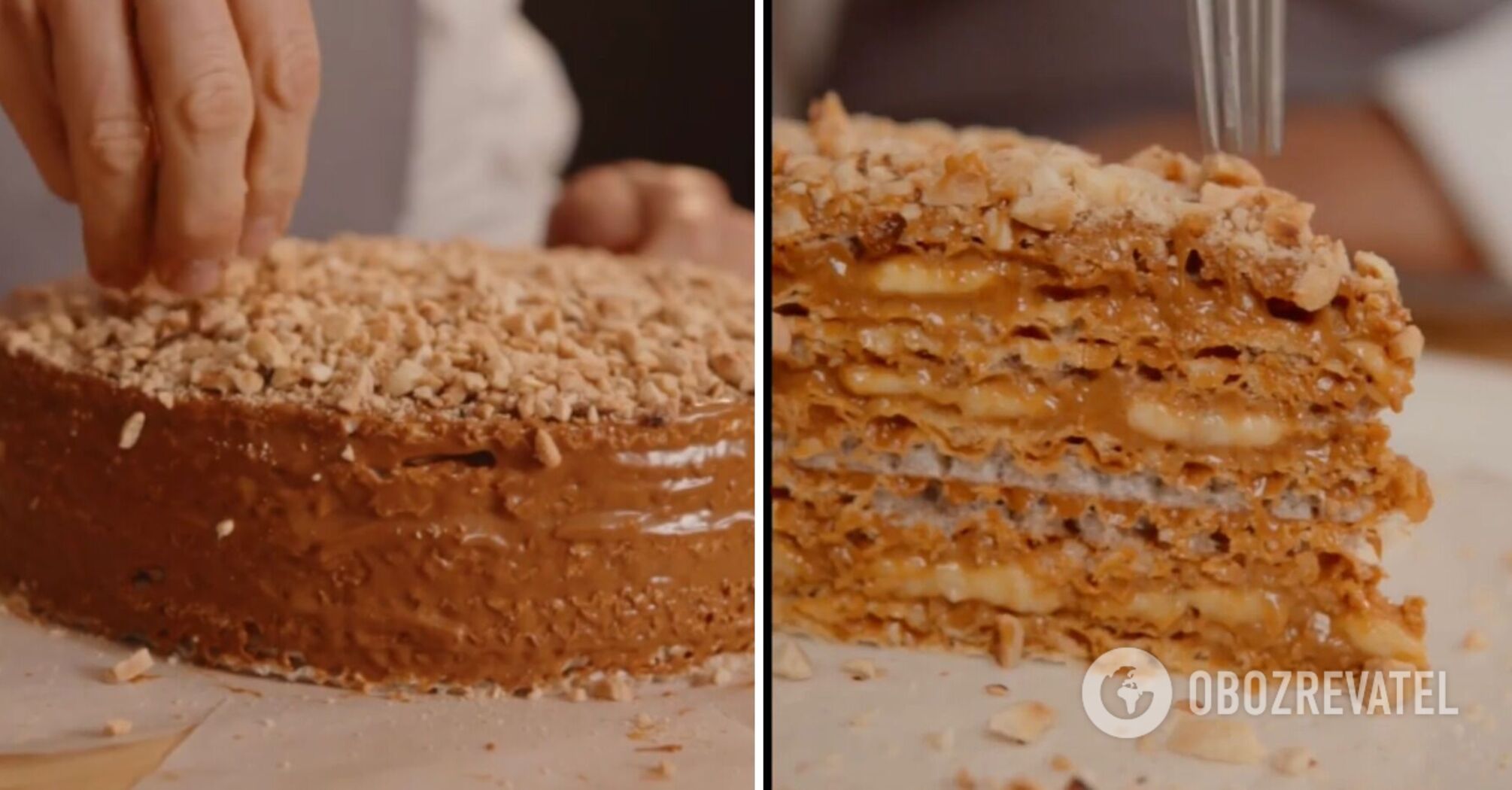 Sprinkle the last layer with peanuts and spread the sides with cream.