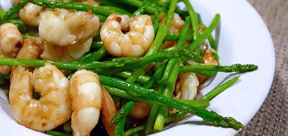 Asparagus is a seasonal green that goes well with many ingredients. The dishes with it are hearty, healthy, and low in calories. It is especially delicious with shrimp.