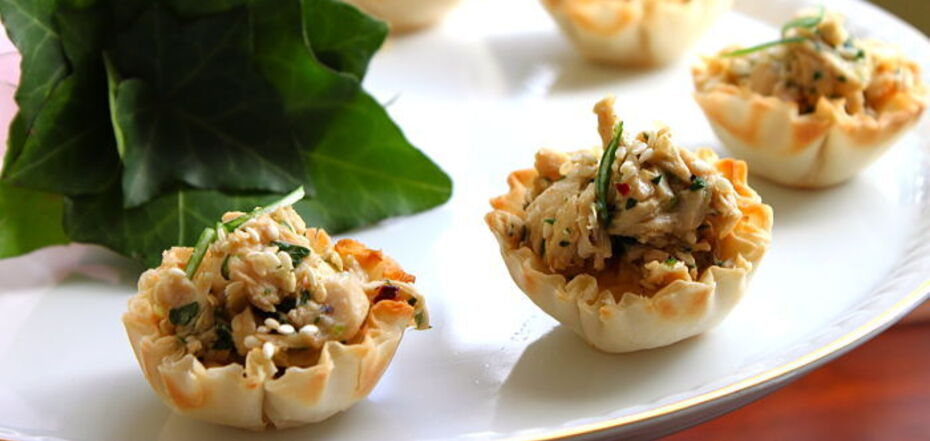 9. Remove the tartlets from the mold. Fill them with lettuce leaves and the two fillings.