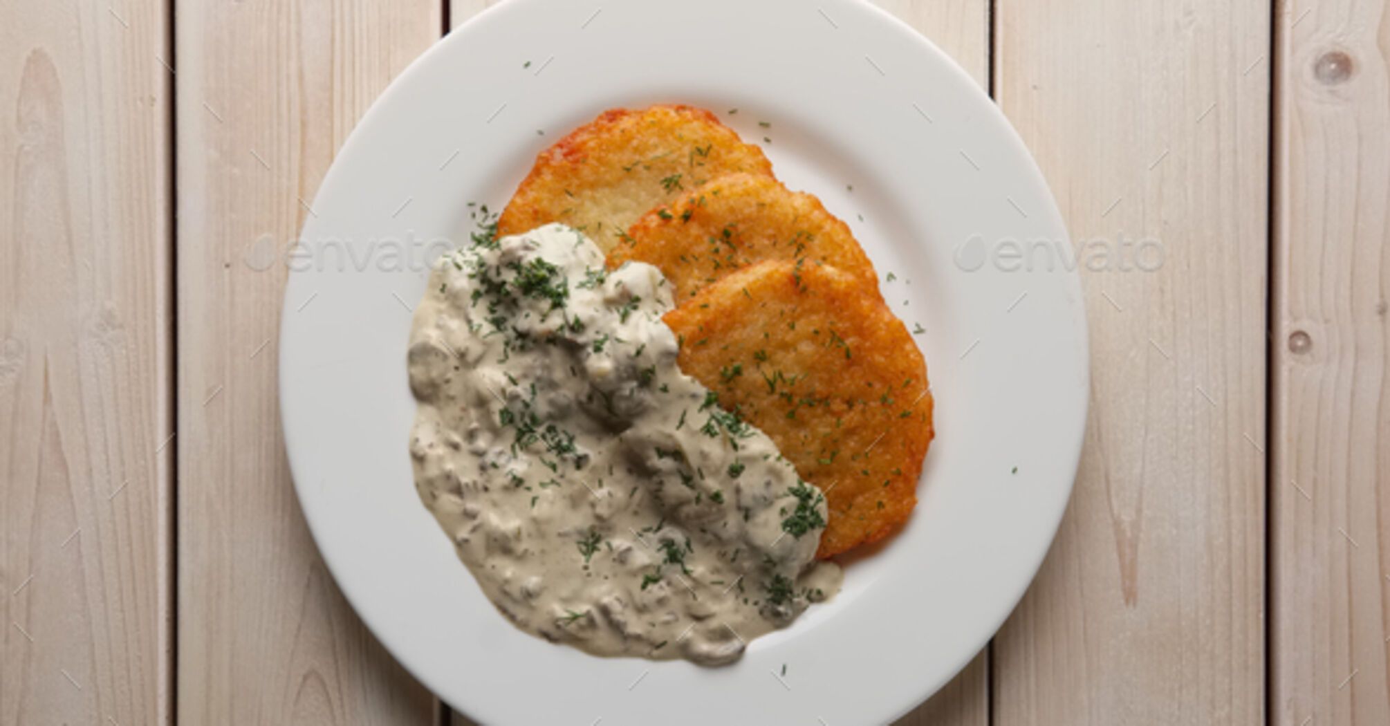 To make classic potato pancakes more delicious and not dry, add a delicate mushroom sauce to them. You don't even have to add sour cream to the pancakes. Also, don't forget to add enough onions to prevent the products from turning black.