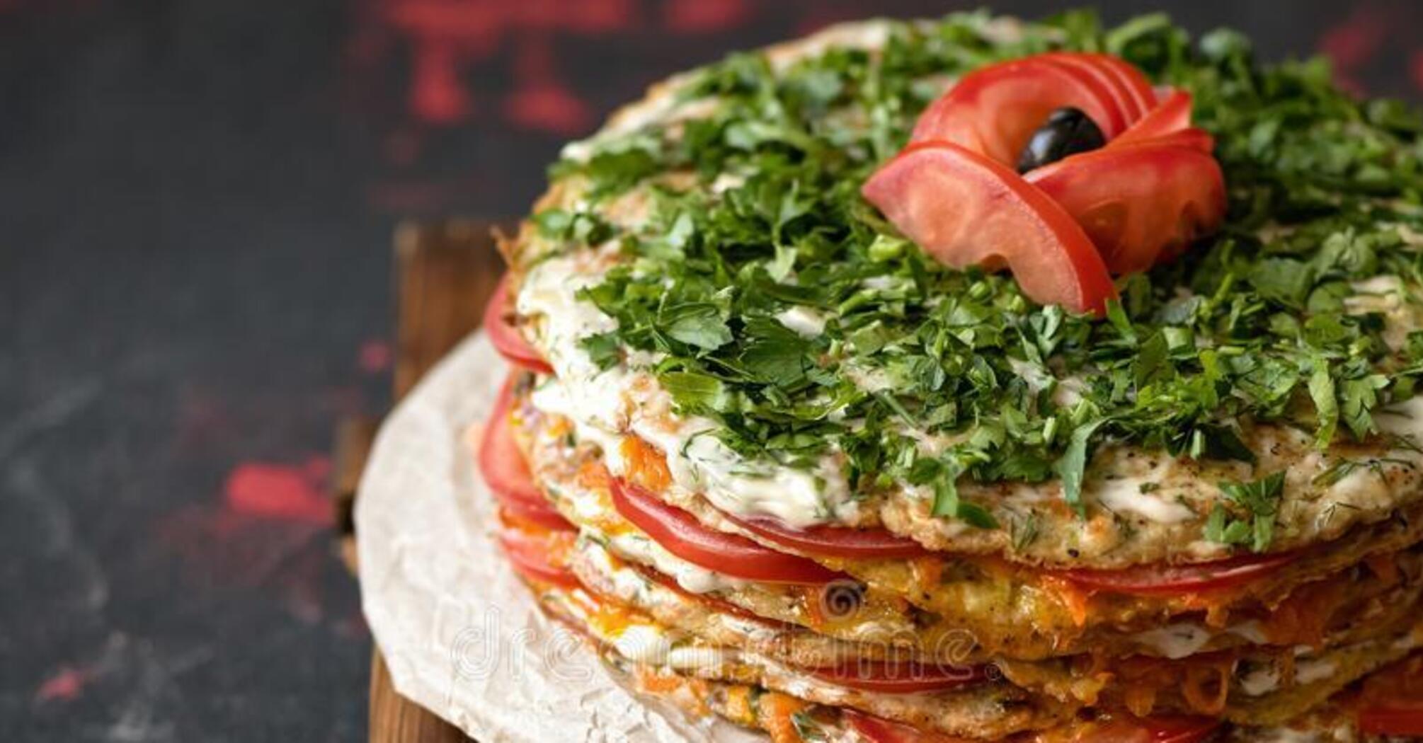 4. Assemble the cake in layers, brush each pancake with the sauce, and add the tomatoes.