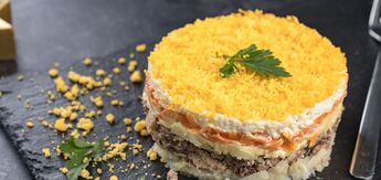Mimosa salad is a very simple, budget-friendly and light salad based on canned fish, vegetables, onions, and mayonnaise. To make the salad tender, add melted cheese.